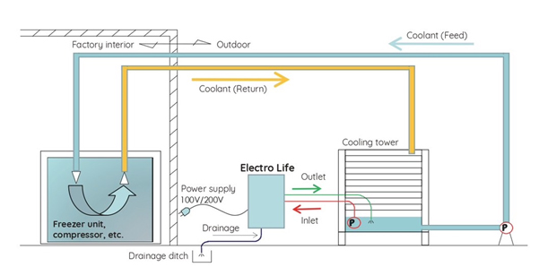 Electro Life เป็นสินค้านวัตกรรมจากประเทศญี่ปุ่น ที่พัฒนาขึ้นมาเพื่อกำจัดคราบตะกรันที่จับตัวในระบบหมุนเวียนน้ำหล่อเย็น เช่น หอทำความเย็น โดยใช้เทคโนโลยีการแยกสลายด้วยไฟฟ้า